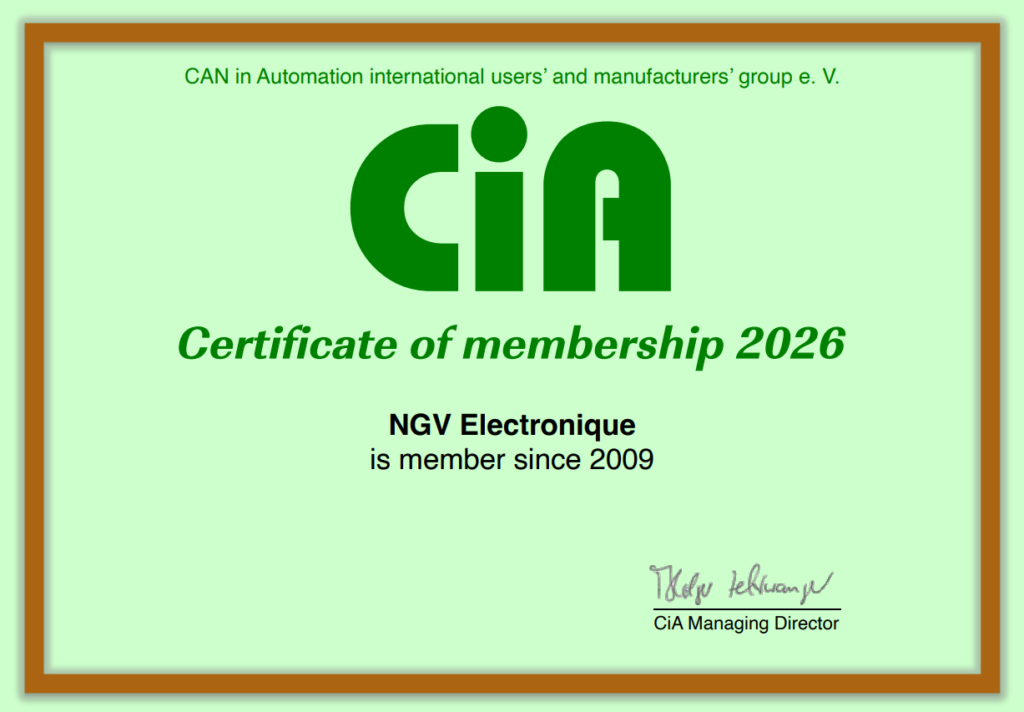 NGV Electronique est membre du CAN In Automation depuis 2009, groupe international des utilisateurs et fabricants pour le réseau CAN (standard international ISO11898). En tant que fournisseur de modules électroniques conformes au standard CANopen, notre numéro “VendorID” est : 000002C3.