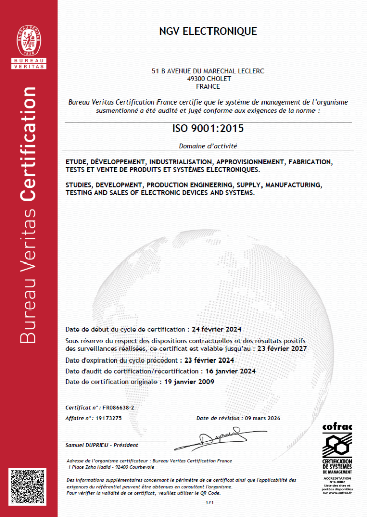 NGV Electronique est certifiée ISO14001 depuis 2008.